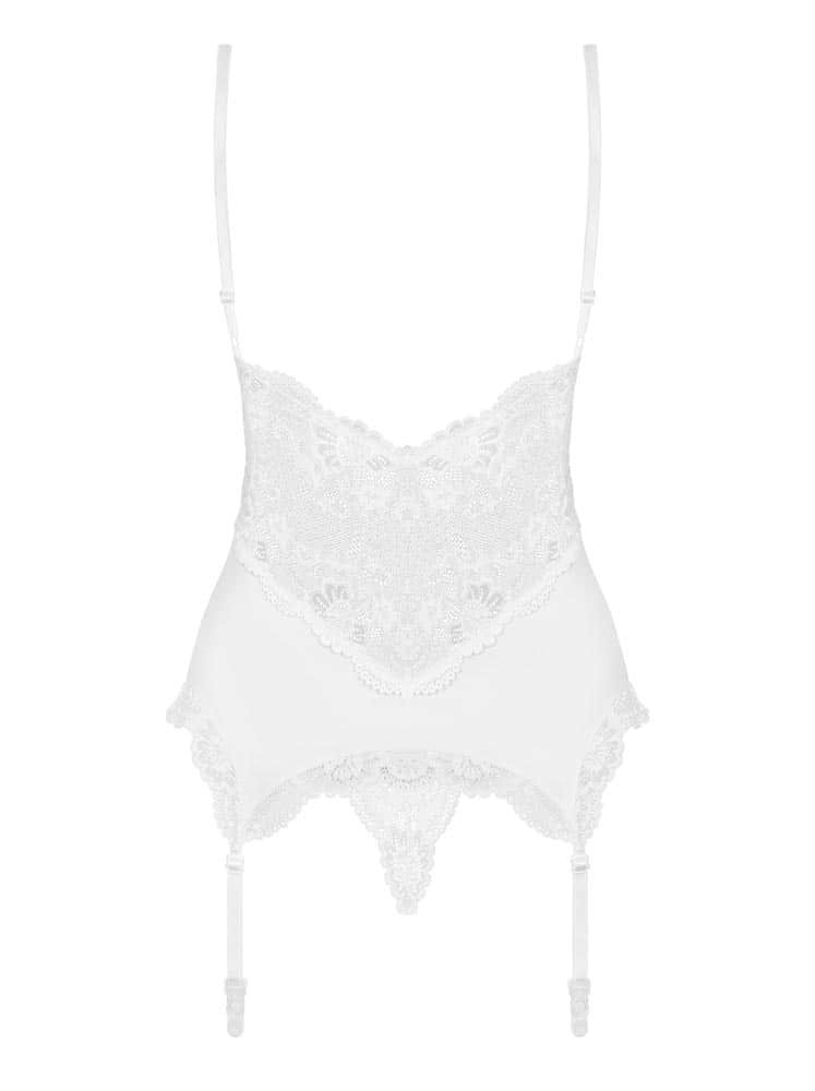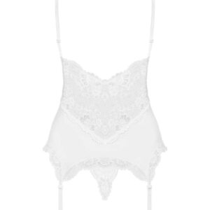 With floral lace, adjustable straps and garters. Soft, padded cups perfectly showcase your chest. A matching white lace string is included. Stockings not included.