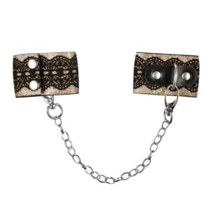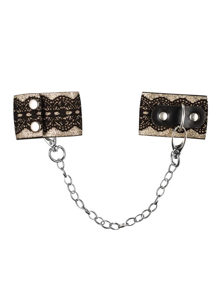 Handcuffs in golden color, decorated with black lace. The handcuffs are made of a soft, slightly brocade fabric and linked together with a chain. They are closed in two steps with two buckles and can be completely disconnected. The pictured nipple covers and the string are not included.