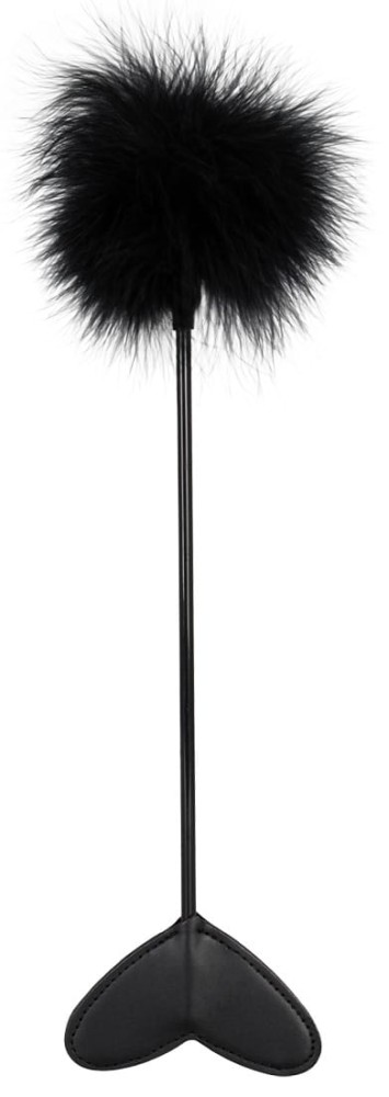 Black feather on an approx. 25 cm long plastic wand with a heart made of imitation leather at the end. Material: Feather, ABS, polyurethane, phthalate-free according to EU Regulation REACH. Contains non-textile parts of animal origin.
