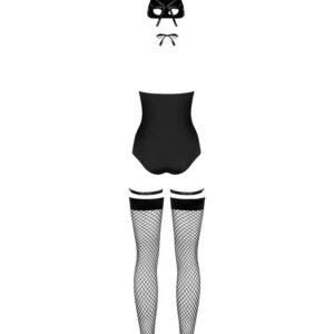 Costume includes: teddy, mask with ears, choker, suspenders and stockings.