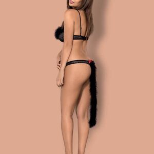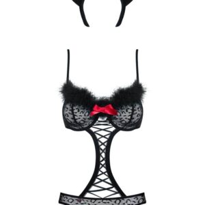 Show your wild side with this sexy, naughty costume! Sheer mesh with leopard print further enhanced with soft fur finish, adjustable straps for perfect fit and wired bra cups to lift and shape your bust, intriguing corset-like lacings – and it's not everything yet. Comfortably cut thongs with removable tail and a cat-ear headband add a playful element, perfect for those up for some fun.