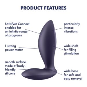 The Satisfyer Power Plug is an anal vibrator with a powerful motor whose 12 vibration programmes show you what anal stimulation really means. Made of supple and absolutely hygienic silicone, the vibrating plug allows you to insert it comfortably. Its slightly wider, ergonomically shaped shaft gives you a particularly filling feeling, while the generous base ensures safety. Let yourself go and enjoy the ride! If the preset programmes aren't enough for you, you can use the free Satisfyer Connect app to turn this well-built pleasure bringer into your very own personal lover: Take control of your plug, create your own personal vibration patterns, experience anal stimulation to the beat of your favourite song on Spotify and much, much more – your desire calls the shots.