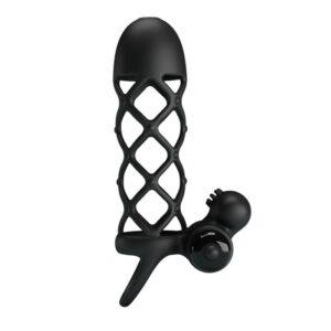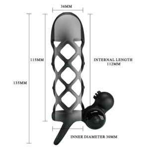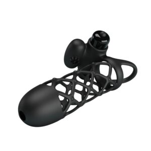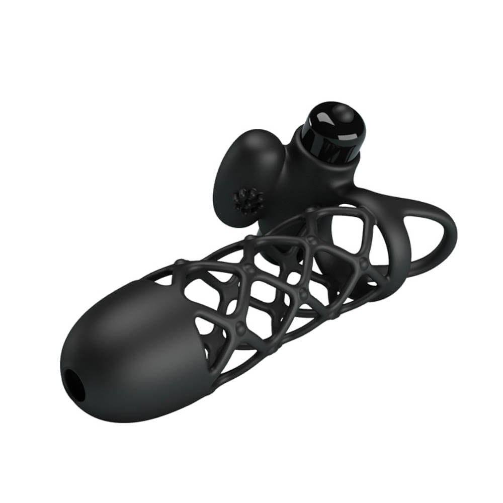 Delivering a firm grip around your prized possession, be strong and steady with the 10 Function Vibrating Cock Sleeve. Let the caged sleeve hug your cock for stronger erection and a bigger impact, while the ball loop ensures your entire package is contained. For her pleasure as much as yours, the protruding clit stim is ready to spur into action as it targets her clitoris during sex. Made from a velvety, black silicone. Turn on the vibrations and explore 10 modes of speeds and patterns as you discover the one to bring you both to a powerful climax.
