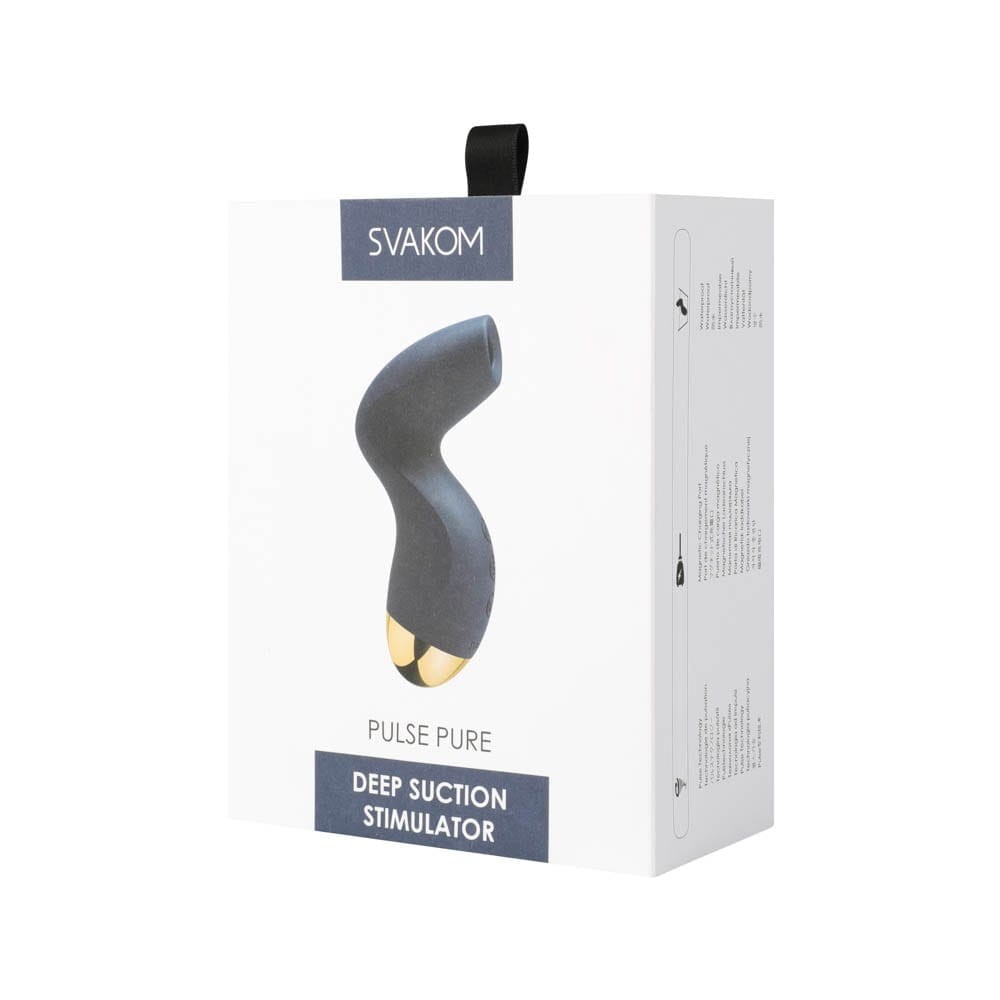 Pulse Technology SVAKOM's newest patented technology is excited to show you just what it can do. Experience the deepest pleasure you have ever felt with targeted suction sure to elicit the deepest of moans. Fast or slow, experience suction deeper than ever before. 5 exhilarating modes each with 5 levels of intensity. Cool down and get ready for your next adventure with ease. Water resistant, Pulse Pure is simple to clean and ready when you need it. Soar delicately towards the deepest climax. Pulse Pure is made from ultra-soft silicone perfectly designed for smooth sessions. Wrap your fingers around the slender `S` shaped body of Pulse Pure and let pleasure bloom anew. Pulse Pure is designed for comfortable handling and easy to maintain grip – letting you try out every single angle.
