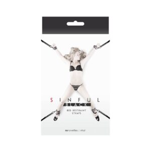 The Sinful Bed Restraint Straps are available in pink or black. The set comes with 4 vinyl straps and 4 12 foot super strong nylon straps. Thread one end of the nylon strap into the double buckle and the other end around the bed post, around the mattress, or if enjoying this set outdoors, around a tree or pole. Then clip your wrist cuff or ankle cuffs onto the round ring and off to play you go.
