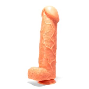 Realistically shaped penis dildo with a skin-like feel, made from a material similar to body tissue, without a motor, with a bendable, highly vascularised surface, complete with testicles. Its suction cup can be attached to a flat surface.